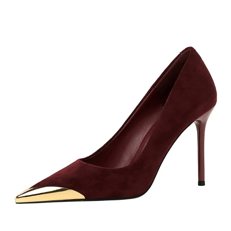 الأوروبية الأمريكية مأدبة أحذية نسائية الكعب العالي الكعب الرفيع من جلد الغزال الضحلة الفم المعادن مدبب اصبع القدم الحديد اصبع القدم ضئيلة أحذية واحدة