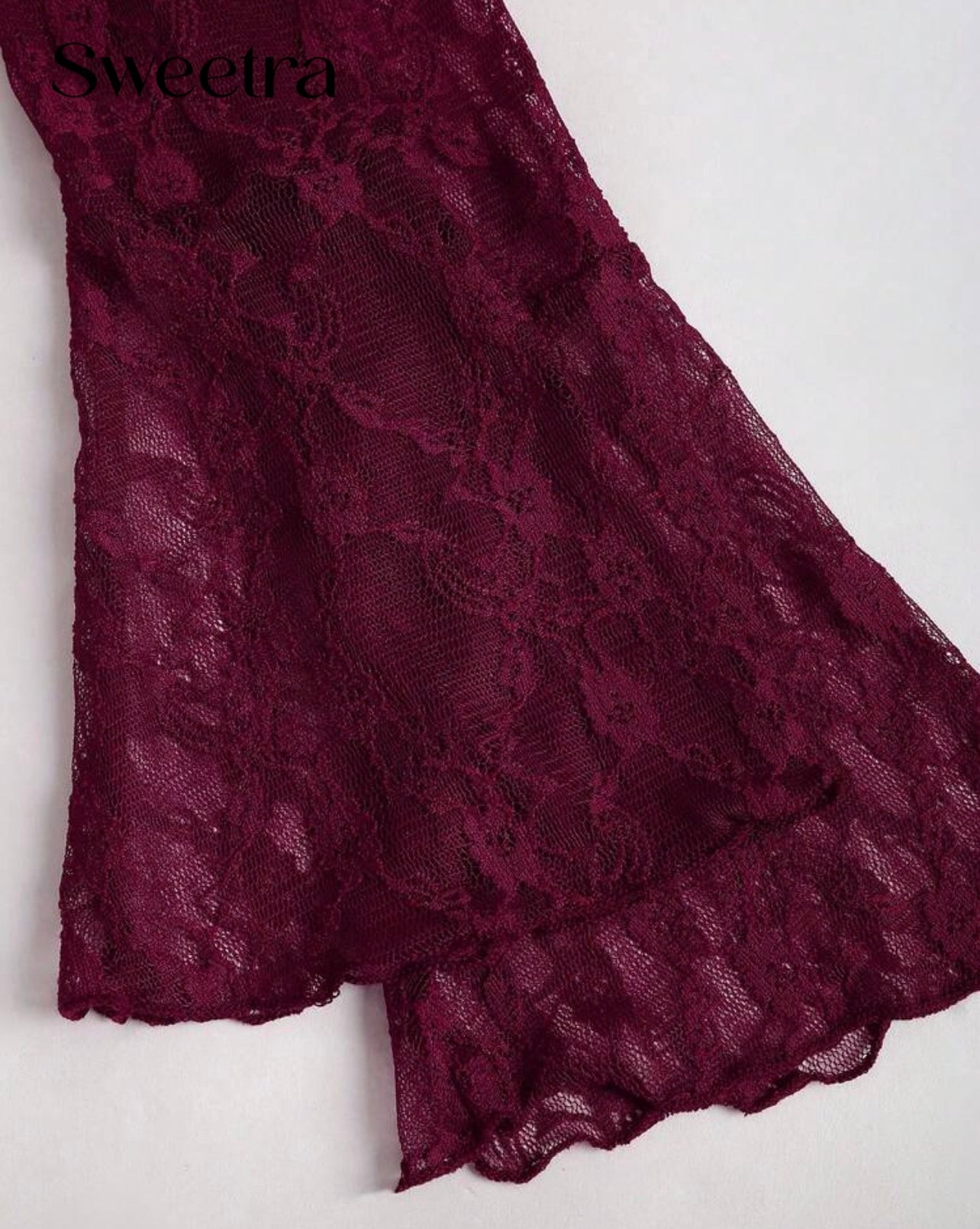 يتميز التصميم بأكمام دانتيل شفافة واسعة بنهاية جرسية (Bell Sleeves)، تضيف لمسة رقيقة ورومانسية.