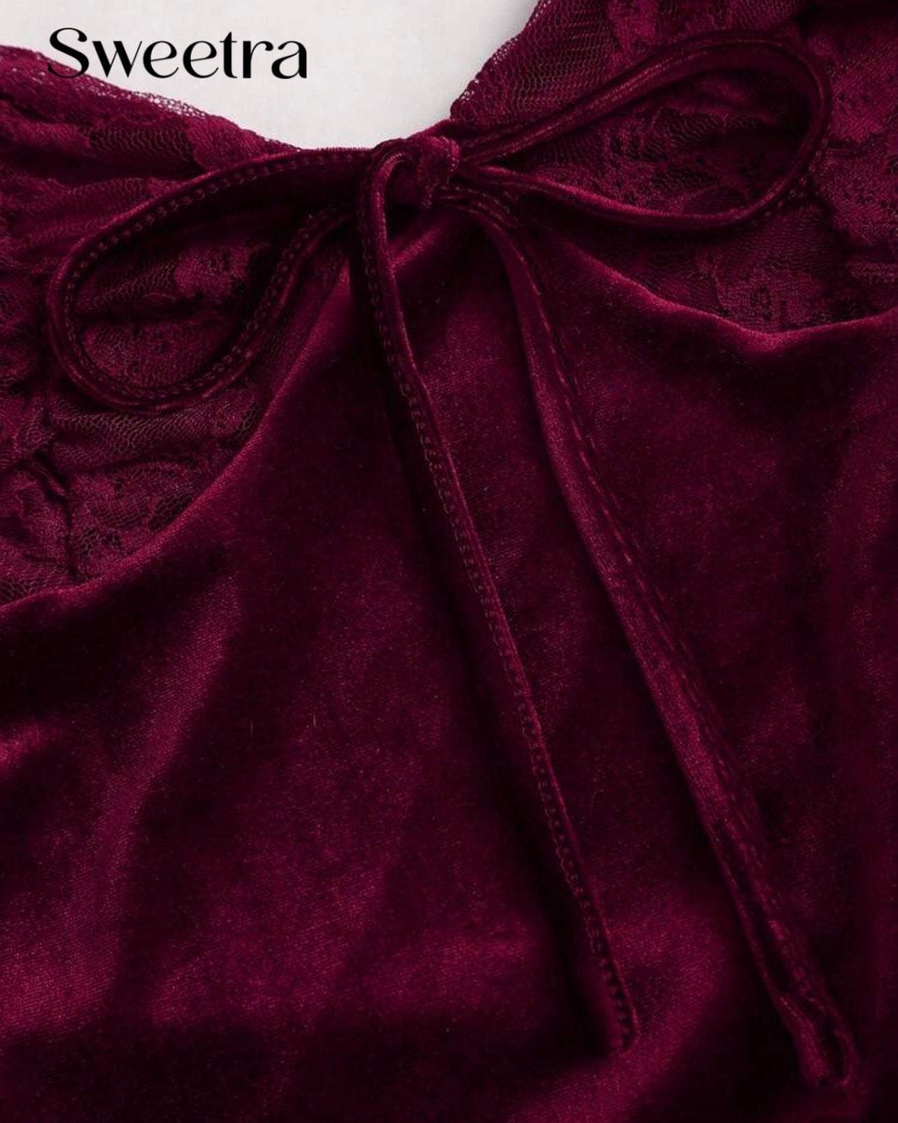 فستان مخملي قصير بأكمام دانتيل – خيارك المثالي للإطلالات الراقية والجذابة